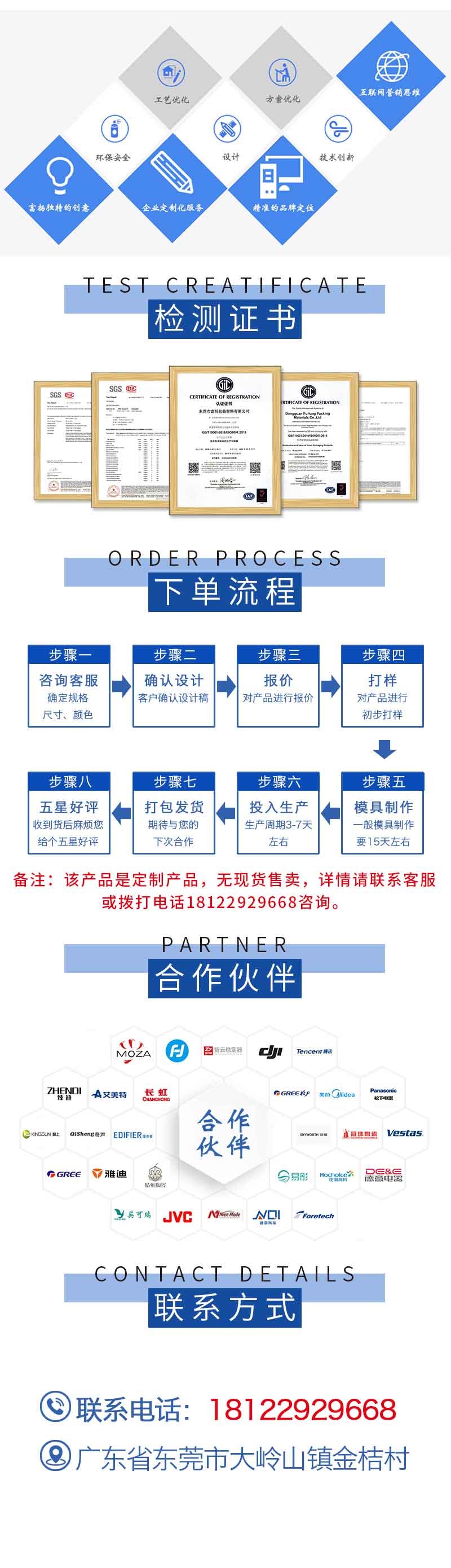 本公司注重客戶的需求與創新,以及提供個性化產品定制和服務為創新目標,努力實現觀念創新、服務創新、產品創新、管理創新、技術創新、經營創新。我們有專業技術人才、及先進的生產設備,我們的產品符合市場需求的優質及環保包裝材料。
